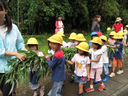 7月6日 登園して・・・・PTAやおやじの会の保護者のみなさんにお手伝いいただいて,年長組のにじ組,そら組の子どもたちが地域の竹薮に七夕の笹をとりに行きました。たくさんの竹の中からクラスごとに自分たちで選んだ竹をお父さんたちに切ってもらいました。車の通る道を長くて重たい竹を運ぶのは大変でしたが,さすがにそら組とにじ組のこどもたち,みんなで力を合わせて無事に幼稚園に持って帰ることができました。保護者のみなさん,ご協力ありがとうございました。