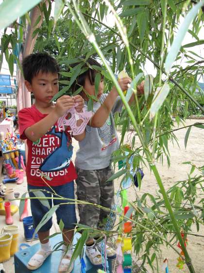 7月6日・・・年長組が自分たちで選んで自分たちで持って帰った2本の竹。とっても大きくて立派な竹です。お父さんたちにお願いして,1本は軒端に,1本は遊戯室に立てました。にじ組にとってもそら組にとっても,自分たちの大切な竹です。さっそく園に帰ったら,今までつくってきた笹飾りの中で自分で好きな飾りをつくっては笹につけにいきました。『貝殻飾り』『わつなぎ』『三角つなぎ』『夜空』『天の川』・・・。