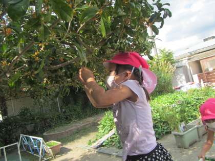 金木犀も良い香りがしてきたので,より身近に香りを楽しむことができるように,木の前に太鼓橋と板を使って橋をかけると,うっとりとした顔で「はぁ〜良い匂い」と子どもたち。