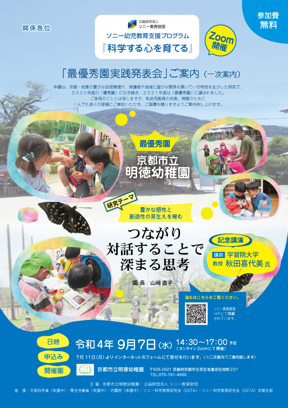 ソニー教育財団 幼児教育支援プログラム 「科学する心を育てる」に,本園論文を応募いたしましたところ,最優秀園に選定されましたので,皆様に実践をお伝えし,研修する機会として実践発表会を開催します。