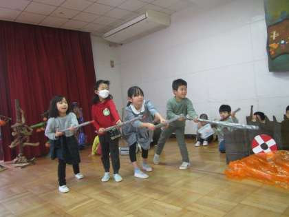 年長にじ組は、「エルマーのぼうけん」をもとにした劇遊びをしたり、合奏をしたりします。