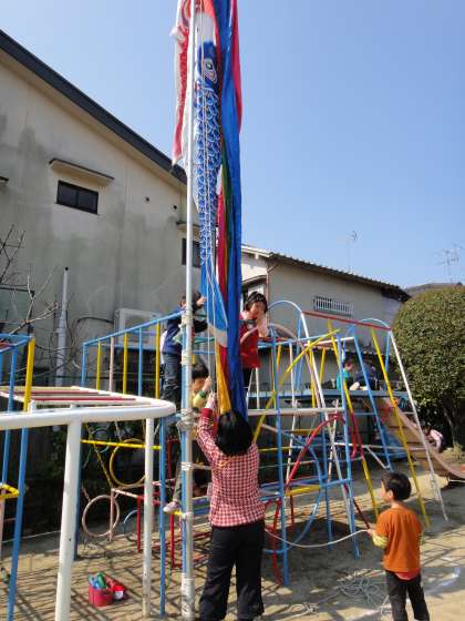 こいが現れると園庭に子どもたちは一緒に駆け出します。園庭に赤いこい,青いこいが泳いでいきます。「ぼくね,こいのぼり大好きなんだ」「こいのぼりあげよう」と年長児も年少児も集まってきました。今日は吹流し,赤いこい,青いこい2匹があがりました。