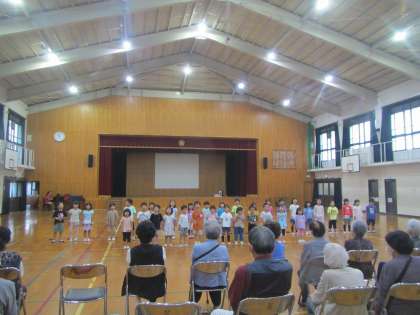 23日、明徳小学校体育館で行われた、明徳学区のすこやかサロンに参加させていただきました。子どもたちは、地域の皆さんに拍手で迎えていただき、幼稚園の歌を聞いてもらったり、一緒にとんぼのめがねを歌ったりしました。帰りには、ハイタッチをして、さようならをし、ホッとしたひと時でした。地域の皆さん、ありがとうございました。