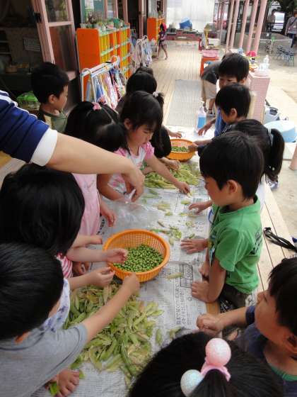 「お豆は…」と苦手な子どももちょっと口に入れてみると「甘い!」とにっこり笑顔になりました。園で育ててみんなで調理した豆ご飯,大勢で食べることで,苦手なハードルも低くなります。食べてみようと心が動く機会になるのですね。