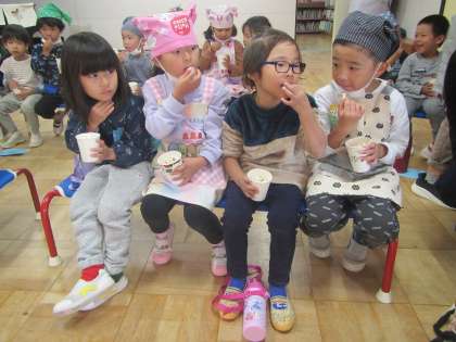 10月29日は、ポップコーンパーティー。にじ組の子どもたちが種を蒔き、世話をし、収穫したポップコーンの実を外し、準備をしました。ポップコーンがはじける様子をじっと見つめ、「おいしくなあれ」と願いながら、つくりました。ポップコーンパーティーの招待状をもらった、はな組の子どもたちは、ポップコーンのいい匂いを感じ、遊戯室へ。ペアの友達と仲良くいただきました。