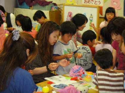 変わり短冊や金魚など丁寧にはさみを使ったり,折り紙で折り返したりなど年長児ならではの少し難しいものもありました。お家の人が見守ってくれる中,がんばってつくっていました。「京の七夕」で飾ってもらう短冊もかきました。「虫をたくさんつかまえられますように」「おひめさまになれますように」「○○(おもちゃ)がもらえますように」などかわいい願い事が並びました。