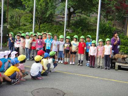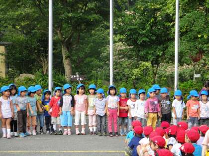 朝の集いで昨日から同じように泊まっている他園の人たちに明徳幼稚園の紹介をしました。動物や虫がたくさんいること,木登りができるキンモクセイやイチジク,ザクロの木があることなどみんなで声を合わせて発表しました。