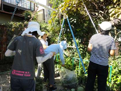 子どもたちが遊ばない園庭には雑草がたくさん生えています。総合遊具の下にもブランコの周りにもいっぱい雑草が茂りました。