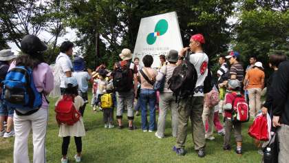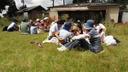 その後,山道を歩いて元スキー場に着きました。すすきの穂が風に揺れ,スズムシやコオロギなどの鳴き声も聞こえます。草原を転がったり,そりあそびをしたりしてお家の人と一緒に楽しみました。