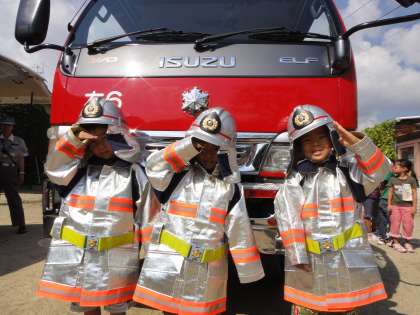 大きくてなんだかごわごわした感じの防火服,そして顔を隠すかのようなヘルメットを着用して小さな消防士が誕生しました。どの子どももうれしそうに,そして恥ずかしそうに消防車の前に立ちます。「消火活動開始!」という声に敬礼をしてポーズも決まりました。