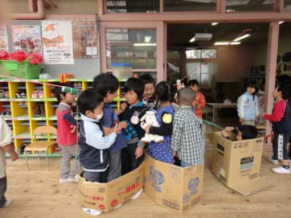 ダンボール箱をつなぎ合わせて叡山電車をつくって走らせているうち,線路ができました。またティッシュの箱に長いビニールテープをつけてロープウェーができました。「人間が乗れる「ロープウェーがいいな」とAちゃん。「どうやってつくろうか?」と投げかけているとBちゃんが「ストローをつけてそれにロープに通すねん」と。ストローは細いのでトイレットペーパーの芯を出しました。テラスに紐を渡すと「ぼくの(ロープウェー)」「わたしの(ロープウェー)」とロープウェーの車両がたくさん並びました。