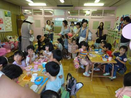 幼稚園についていろいろお話を聞いていただいた後は,絵本の読み聞かせと大好きなどうぶつ体操をしました。音楽に合わせてみんなかわいいポーズで体操を楽しんでいました。そのあとは,在園児のお弁当の様子を見ていただきました。お弁当つくり大変!と思っておられるお母さんも,子どもたちのお弁当を見て安心!にっこり笑ってホッとして帰っていかれました。