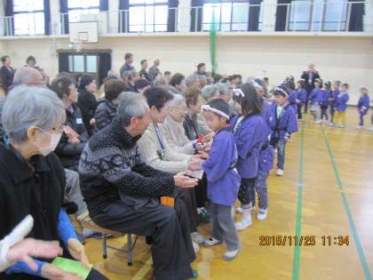 毎年,幼稚園の子どもたちが地域の祖父母の方たちと交流をする『ふれあいサロン』があります。今日は,幼稚園の祖父母参観と合流し第二部として,『ふれあいサロン』に参加することにしました。幼稚園児の祖父母の方たちも一緒に参加していただくために小学校の体育館に移動していただき,子どもたちの歌や踊りを見ていただきました。