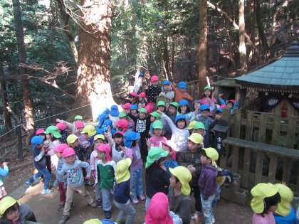 秋色に包まれた道は坂道や階段がいっぱいありましたが,地図を片手に「今どこかなぁ」と探検を楽しみながらこつこつと登りました。登った先には山の眺めと朱色の本殿が広がり,子どもたちは「やったー!」と達成感でいっぱいでした。お弁当の後は奥ノ院をさらに探検!不思議な石にたどり着き,「ちょっとドキドキしたけど探検できたなぁ」と嬉しそうな子どもたちでした。暖かい日に恵まれて良かったですね。