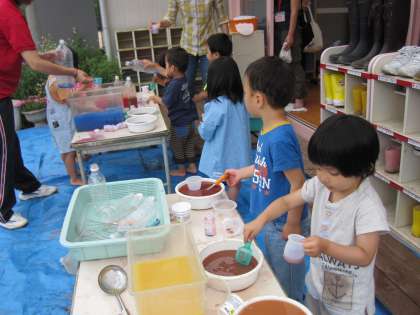 あいにくの雨模様で、外では絵の具ができなかったのですが、遊戯室でたくさん遊びました。
