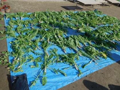 年少組が子どもたちが育てた大根を抜きました。「こんなん出てきた!」「おっきい!」「赤ちゃんやった!」…たくさん掘れた大根。「おでんにしたいなぁ」「おみそしるに入れたいな」「スープがいい!」おみやげの1本は何のお料理になるのでしょうね。