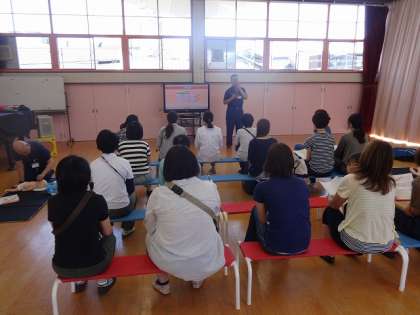 今日,家庭教育講座がありました。右京消防署の方を講師に招いて,普通救命講習会をしました。始め,ビデオを見て,応急手当の重要性や救命の仕方を教わりました。その後,実際に人形を使って心肺蘇生法を習いました。参加されたお母さんたちは,真剣に取り組まれていました。
