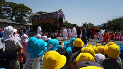 今日は5歳児ゆり組の子どもたちが葵祭の見学に京都御苑へ行きました。建礼門の前に教育委員会から席を用意していただき,ゆっくりと葵祭り見ることができました。前日に葵祭の冊子を持ち帰り,家で見ていた子どもたちはきれいな花笠や大きな牛車に「きれい〜」「牛すごい力!」と声をあげていました。斎王代さんを見て「お雛様みたい」と感じた子どももいました。子どもたちにとって,いつもは見慣れないきれいな着物や昔の道具に触れるよい機会となりました。
