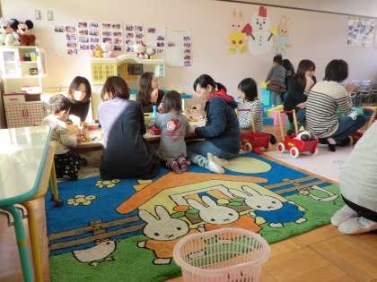 お部屋でほっこり,ままごとしたり,積み木で遊んだり,ママたちも久しぶりに出会ったお友達と楽しそうに会話が弾んでいました。