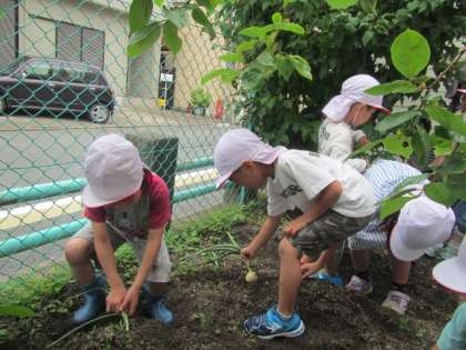 かわいい小さめのタマネギがたくさん収穫できました。どんな料理にして食べたいかを相談してみると・・・「シチューがいいな」「お味噌汁もおいしいよ」「カレーにもタマネギ入れるよね」といろいろなアイデアが出てきました。「でも,タマネギを切る時に涙が出ちゃうかも・・・」と心配している子どももいます。何をつくるかみんなで計画していきたいです。