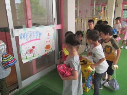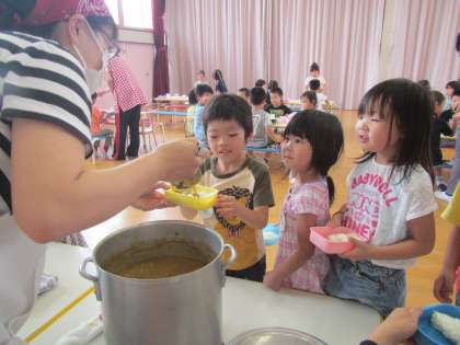 遊戯室にカレーパーティーの会場,レストランができました。ゆり組の子どもたちはさくら組の友達にカレーのチケットを配り,遊戯室へ招待します。そしてみんなで「いただきます」の大きな声。アッという間にご飯もカレーも売切れになりました。「少し苦手だったナスも食べられた」と嬉しそうに保護者に伝える子どもたちでした。学校運営協議会からお手伝いに来ていただきありがとうございました。