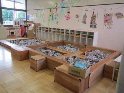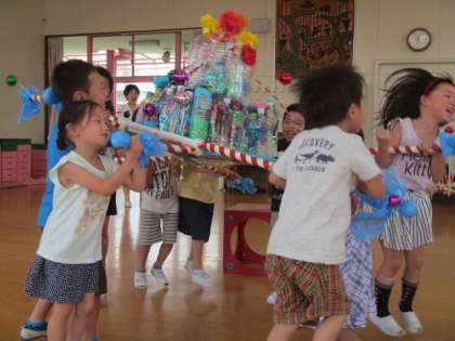 明日は幼稚園の夏祭り。子どもたちは夏祭りに向けてつくってきたお神輿が完成し,みんなでかついでみました。「わっしょい!」の掛け声に明日への期待感が募ります。保護者の方も準備をがんばってくださいました。楽しそうなゲームコーナーが完成しました。明日は未就園児のお友達も来てくださいね。待っています。