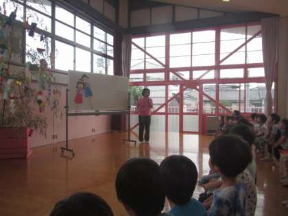 今日は七夕の集い。大笹に飾りや短冊を飾り,集いました。七夕のお話を聞いたり,うたを歌ったりした後,こんぺいとうと星形ラムネのおやつをいただきました。七夕のお願い事がかないますように!