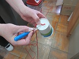 4 もう一方のたこ糸のはしをもう一つの紙コップに通して結ぶ。
