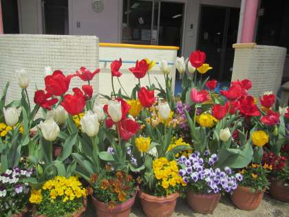 子どもたちが植えたチューリップの球根がぐんぐん大きくなり,きれいな花を咲かせています。エンドウ豆も花が咲き,背が高くなりました。みんなが見てくれるのを待っていますよ。