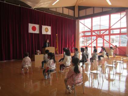 令和2年度 始業式を行いました。白いゆり組の名札を見つけた子どもたちは進級の喜びを感じ,少し緊張気味で式に臨みました。