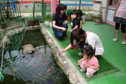 「金魚のえさください」と,保育室前の金魚にえさをあげたり,園庭でほっこり,砂遊び。「はだし気持ちいいなぁ」「泥んこ大好き」