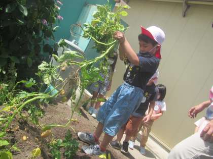 ゆり組(年長児)の子どもたちが幼稚園の畑で実ったジャガイモを収穫しました。