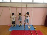 今年は,コロナウイルスの影響で日曜参観ができず,親子で竹馬をつくることができませんでした。楽しみにされていた保護者の方には申し訳ありませんでした。しかし,昨年のゆり組が竹馬に乗って遊ぶ様子にあこがれを感じていた子どもたちは,自分たちで竹馬をつくろうという気持ちを持ちました。