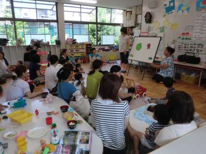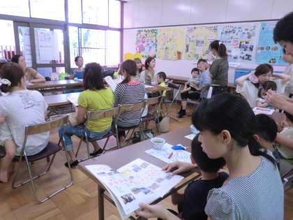 今日の「ひよこ組」の日に,PTAの方たちが園内ツアーを計画していただきました。 お茶を飲みながら,幼稚園のことや子育てについての悩みを話し合ったりして交流しました。