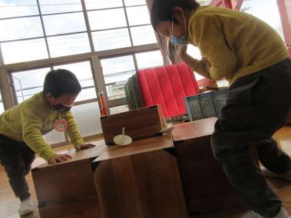 AちゃんとBちゃんが遊戯室に出かけて、Aちゃん「ここで回してみよう!」Bちゃん「いいよ!」と積み木の上でコマを回し始めました。狭い場所に狙って回すことも面白い様子でした。「僕のはまっすぐ回ってる!Bくんのはいっぱい(長く)回ってるね」とAちゃん。友達と一緒に回す中で自分のコマや友達のコマを見比べて様子に気が付いたり,気づいたことを伝える姿がありました。