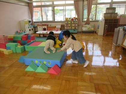 かめたくんと一緒に散歩をしました。かめたくんが危なくないようにおもちゃの場所を変えたり,かめたくんの歩く速さに合わせていました。