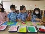 さくら組の子どもたちが絵具遊びをしました。好きな色を選んで,ローラーや型押しを楽しみました。手に付けてぬるぬるも楽しみました。きれいな色になったね。