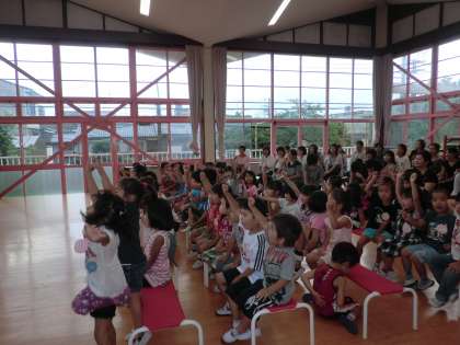 最後にみんなで元気に「エイエイオー!」をして,後ろにいる保護者の方に♪今日も元気!♪の歌を聞いてもらいました。