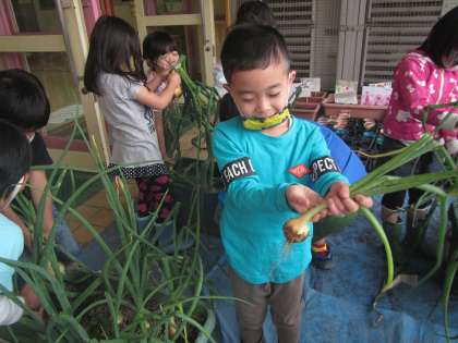 今日はさくら組の時に植えた玉ねぎを収穫しました。抜くときには,両手で「よいっしょ!!」と力を込めながら収穫しました。玉ねぎが抜けると「抜けたー!!」と喜び,根っこを見て「そうめんみたい!」と笑う姿もありました。「今日はこれで玉ねぎスープつくってもらおう!」と楽しみにする子どももいましたよ。
