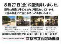 8月の公園清掃をしました。今日は預かり保育参加の子どもたちが頑張ってくれました。そして,絵本返却に来ていた子どもたちもお手伝いをしてくれました。ほうきで落ち葉を集めようとすると,今日は木の皮がたくさん落ちていました。「どうしてこんなに木の皮が落ちているのかな?」不思議ですね。