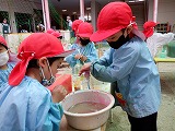 色水遊びでは,赤,青,黄の色水を自由に混ぜて色が変わることや,自分の色水をつくることを楽しんでいます。混ぜているときは考えを巡らせているのか真剣な表情に・・・。出来上がると「緑色になった!」「紫ができた」と大喜びで教えてくれます。友達と一緒に混ぜてつくることを楽しんでいる姿も見られます。友達がつくった色水を見て,「あんなのがつくりたい」と工夫する姿も見られます。友達と一緒に楽しみながら,水の感触や気持ちよさ,色の美しさを感じています。