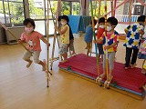 参観の時につくってもらった,世界に一つだけの竹馬。子どもたちは,お家の人のパワーが詰まった竹馬に一生懸命取り組んでいます。一歩踏み出すには勇気がいりますが,何度も挑戦しています。乗れるようになった子どもは,坂道に挑戦したり,高さを上げたりして楽しんでいますよ。