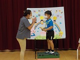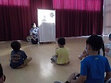 今日は、8月生まれのお友達のお誕生日会をしました。夏休み中に誕生日を迎えた子どもたち。みんなにお祝いの言葉や、歌のプレゼントをもらい、嬉しそうでした。お楽しみでは、影絵を楽しみました。「どうして色が映るのかな?」「なんでカーテンに映るの?」といつもとは少し違うお楽しみを、興味深く見ていました。