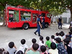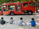 その後は、消防自動車の見学。子どもたちは、目を輝かせながら消防自動車を見たり、ホース等の小物をもたせていただいたり、質問に答えていただいたりしました。