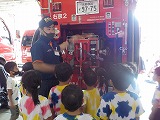 今日は消防署見学に行きました。消防車や救急車に乗せてもらったり、消防士さんに、訓練の様子を見せてもらったり、消防士さんの服をきせてもらったりしました。子どもたちはなかなかできない体験をさせてもらい、とても嬉しそうでした。自由画帳とハンカチのお土産もいただきましたよ。園に戻ってから、消防車の絵をかきました。消防士さんに教えてもらったことを表現する子どももいました。右京消防署の皆様、今日は本当にありがとうございました。