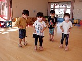 たくさんの子どもたちが一本歯下駄に挑戦して楽しんでいます。先生に見てもらって「すごいなあ!」と言われて大喜び。友達と一緒に広い遊戯室を歩いて回りました。