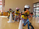 今日は、キックバイク教室があり、5歳児ゆり組が参加しました。乗ったことがある子どもも乗ったことがない子どもも、楽しんで参加していました。交通ルールも教えてもらい、止まれの標識では止まって左右を確認したり、信号が青になったら出発したりしながら楽しみましたよ。