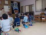 そんな中、突然、赤鬼が出てきてみんなびっくり!!「鬼は外!福は内!」と、一生懸命豆をまいて、鬼をやっつけました。ちょっと怖くてドキドキした節分の集いになりました。
