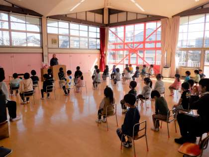 今日は,5歳児ゆり組の修了式の練習に,4歳児さくら組と,未就園児いちご組の子どもたちが参加して,お兄さんお姉さんがかっこよく証書をもらいに行く姿を見たり,お別れの言葉を聞かせてもらったりしました。大好きなゆり組さんが一年生になることを,さくら組やいちご組の子どもたちは感じながら,「おめでとう」「一緒に遊んで楽しかった!」などとお祝いの気持ちをもちました。もちろん,「寂しい」という気持ちも感じながら・・・。