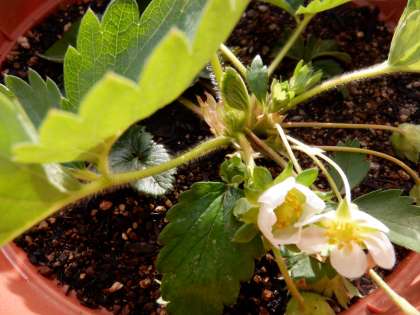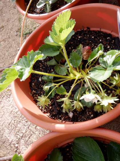 5歳児ゆり組が一人一鉢栽培で育てているイチゴがぐんぐん生長し,子どもたちは,「やった!緑のイチゴができてる!」「イチゴのお花かわいいな!」と喜び,はりきって水やりをする姿が見られました。昨日入園したばかりの4歳児さくら組の子どもたちも,「イチゴ,どこどこ?」と興味をもって見に来ました。おいしいイチゴになりますよーに!